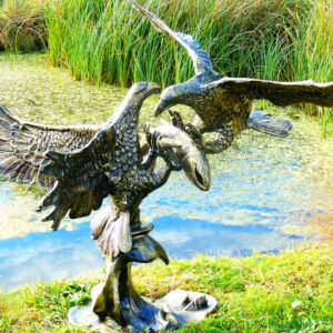 A Pair of Fighting Eagles garden statue. Two dominant birds do battle for that last salmon. Ideal beside a water feature or beside a pond. The fine detail is captured in this life-size statue that will excite anyone that happens to see them. Why not see our other eagle on a rock statue to bring even more attitude and grace to your outdoor space.