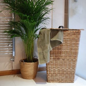 This linen bin is cotton lined and has a loom style weaving around the metal frame.