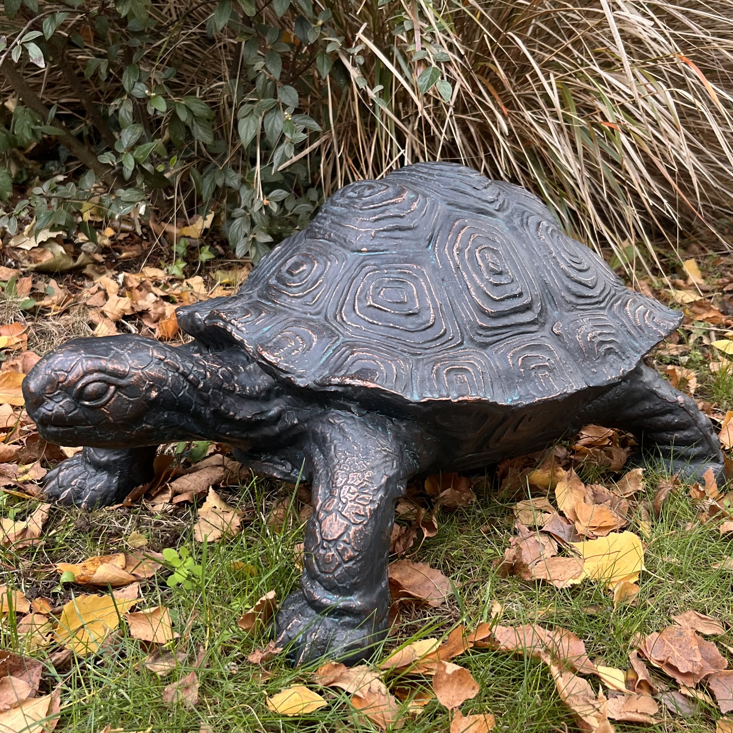 Made from recycled aluminium, our new large tortoise garden ornament will stand the test of time from the weather. Whether you wish to stand it near the pond or in a shady spot out of the sunshine, the beautifully hand-finished garden feature will sit handsomely in any garden spot.