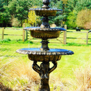 Four tier mermaid water fountain. Two elegant mermaids hold up the four cascading bowls as they spill over into your pond. Suited in any part of the garden, this wonderfully bold yet elegant water feature is a great example of what can be made with recycled aluminium and hand painted to give it that lavish style.